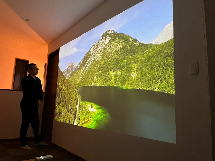 大画面で野球や旅番組が見たい!プロジェクターは欲しいけど部屋が狭くて大画面にならない!買ったけど準備や片付けが意外と大変。目の前のテーブルに置くからテーブルが狭くなるし配線も邪魔。高画質高音質でコンパクト。続きは寝室でも見たい。そんな自分が欲しくなるプロジェクターが無いので開発してみました。近くで見ても影が映らない圧倒的な没入感!それでいて消費電力は85インチLEDと比べて1/5以下です。