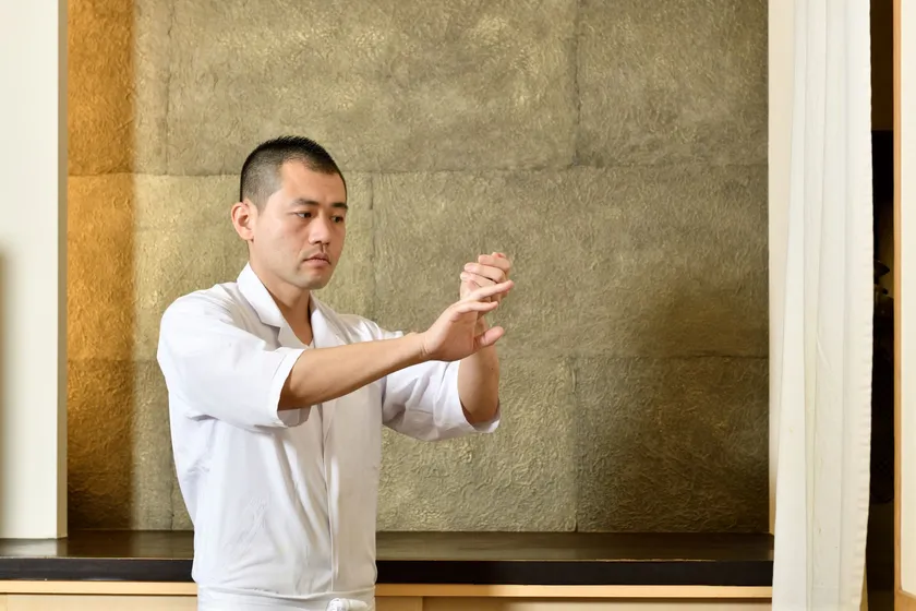 寿司職人・萱沼氏は、客人として「鮨 くりや川」へ訪れた際にその味に惚れ、その後、幾度となく来店。「鮨 くりや川」の技を習得したいと門をたたきました。中央大学経済学部から証券会社へ入社し勤務をしていた経験のある彼が魅力を感じたのは、“1人から100万円をいただくよりも、100人の方から1万円をいただけるような仕事”。沢山の方に笑顔になっていただけるよう、日々職人の技を磨きます。研鑽を積んだ腕で振舞う拘りのにぎりをお楽しみください。