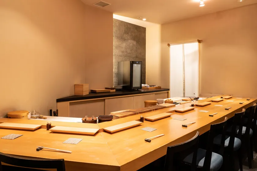 カウンターのみ最大8名まで可能。少人数の接待やご友人との会食は取り分けの必要がなく会話の邪魔をしないカウンター寿司が最適です。質の高いネタに施される繊細な江戸前しごとのにぎりをコースでご堪能ください。