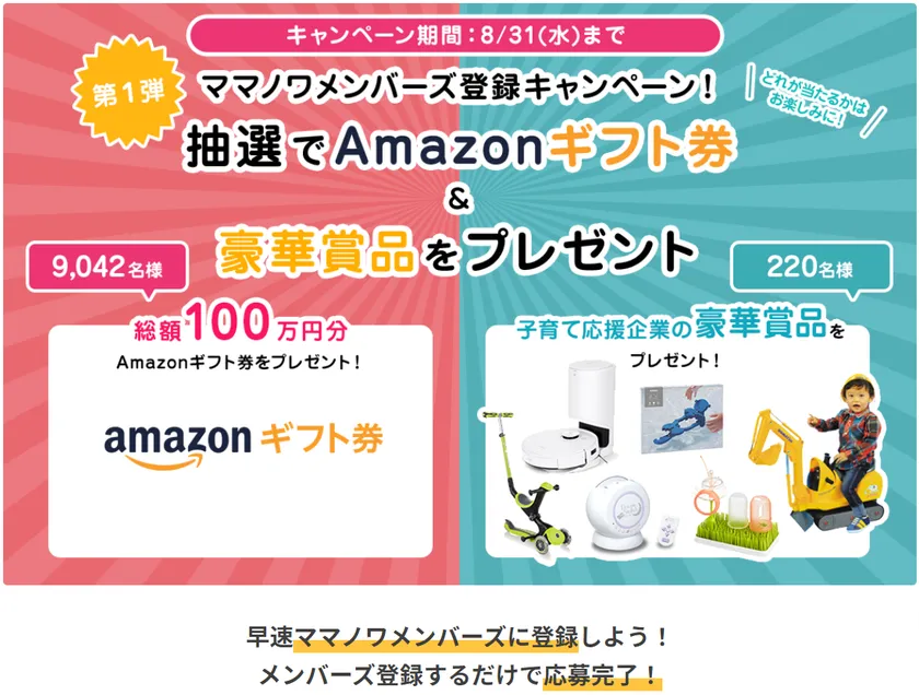今ならママノワメンバーズ登録をすると抽選で総額100万円分のAmazonギフト券、子育て応援企業の豪華賞品をプレゼントします。