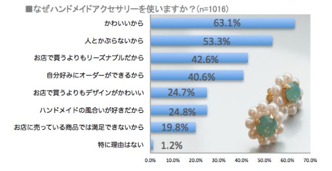少し以前の調査結果ですが、この表をみると、ハンドメイドに「個性」を求めている心理が垣間見えます。たとえ、ブランド品であっても、大量生産のアクセサリーではもはや満足できない人が増えているといえます。そんな中で、「自分だけのオンリーワン」こそが気分を上げてくれる、というわけなのでしょう。また、ハンドメイドの場合は、アレルギーへの対応がしやすいというメリットも人気の理由にあがっていました。