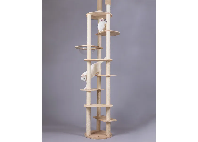 宇宙ステーションのようなスケルトンボウルは大きめでゆったり。おねこさまにとってはお昼寝に、ご主人さまにとっては肉球をじっくり観察できる特等席です。2本の柱で固定されているので安定感抜群。ステップと付け替えが可能で猫ちゃんの性格や運動能力に合わせてカスタマイズできます。