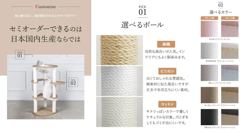 セミオーダーなら他と被らない「我が家だけのカスタマイズ」も可能です。爪とぎポールはコットン・ビニロン・麻ひもの3種類から選べ、ステップの素材やカラーのご要望にも柔軟にお受けいたします。アレルギーのあるご主人様や誤食しがちな猫ちゃんにも安心です。