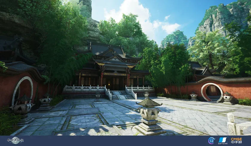 山頂に位置する天師門は、風水に基づき、陰陽八卦にしたがって建築された。幾重にも重なる雲や霧の中を進むと、青瓦と白い塀、そして上空には護山大陣という魔法陣もかすかに見える。大陣の陣目には精緻な四象天灯が浮かんでいる。