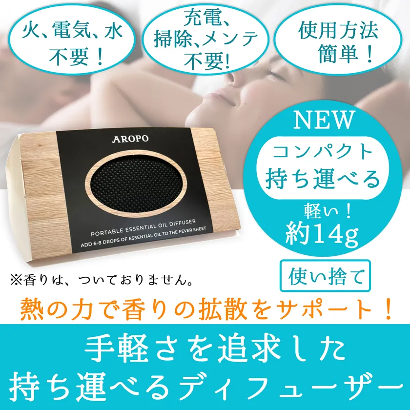 火・電気・水を使用しない、安心安全で環境にも優しい紙製ポータブルアロマディフューザーです。カイロの原理を利用し、アロマ専用に開発した発熱シートで約40~50分間香りを熱拡散します。床もベタつかず、機械音もなく、ノンストレスで香りを楽しめます。世界最薄クラスのコンパクトな名刺より一回り大きいサイズで、どこへでも持ち運び可能。充電・掃除・メンテナンスが不要で手軽に使えます。基本的には使い捨てですが、使い終わった後はアロマストーン替わりに数回使用可能です。