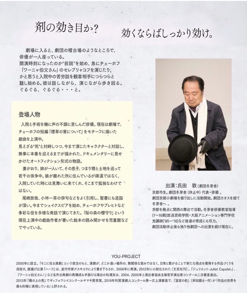 入院と手術を機に声の不調に苦しみ、見えざる“死”と対峙する俳優が、今まで演じたキャラクターと共に闘い、無事に本番を迎えるまでを、チェーホフや聖書、また尾崎放哉、小林一茶の俳句などの引用と共に上演。