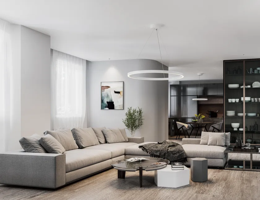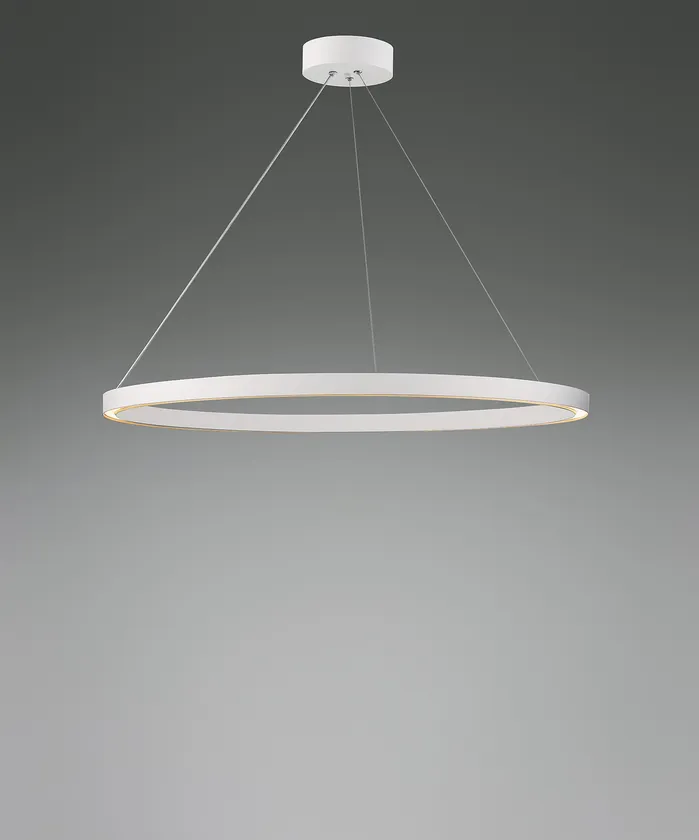 シンプルなデザインとクオリティを追求したリング型調光シャンデリア。発光面は、灯具内部の粒感を隠す為にシリコン素材を使用し、眩しさを感じにくいフラットな「光の輪」を実現しました。発光面の側面は、テーパーを施し、ソリッドでシャープな印象を与えるデザインとなっております。3サイズ展開で(Φ1000/Φ800/Φ600)空間のボリュームに合わせてサイズをお選び頂けます。また色温度は、3色展開で(2700K 電球色/3500K 温白色/5000K 昼白色)専用調光器を設ければ100%~約1%まで調光が可能です。電源線自体が吊具として機能するように工夫し、フランジ部分のデザインもシンプルにする事で灯具を引き立たせ、空間の邪魔をしない設計となっております。