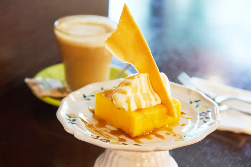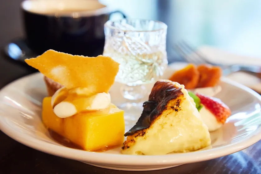 カフェタイムは、デザートも充実。ワンプレートでいろいろなデザートが盛り付けられているデザートプレート(写真下)「POSTRE ORQUESTA(ポストレ・オーケスタ)」コーヒー付き(¥1,650)をはじめ、オープン当初から人気の「バスク風チーズケーキ(¥825)」や、たっぷりと卵黄を使ってしっかり固めた、レモン風味で爽やかに仕上げたスペイン伝統菓子「レモン風味のトシーノ・デ・シエロ(¥770)」など、常時7種類のケーキが味わえます。