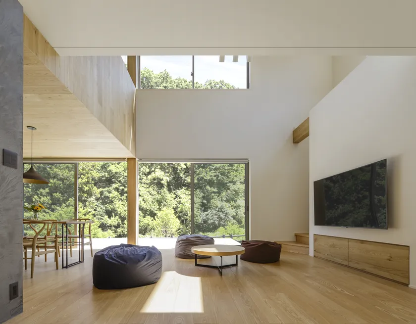 リビングの北東側は、大きなガラス戸にし、部屋のどこにいても四季折々に変化する景色を楽しむことができるように設計しました。1、2階は吹き抜けになっており、縦横に広がる窓と相まって、解放感は抜群です。さらに2階には子ども部屋と寝室があり、寝室の吹き抜けに面する壁を四角く、くり抜きました。その理由について、夫・Rは…。