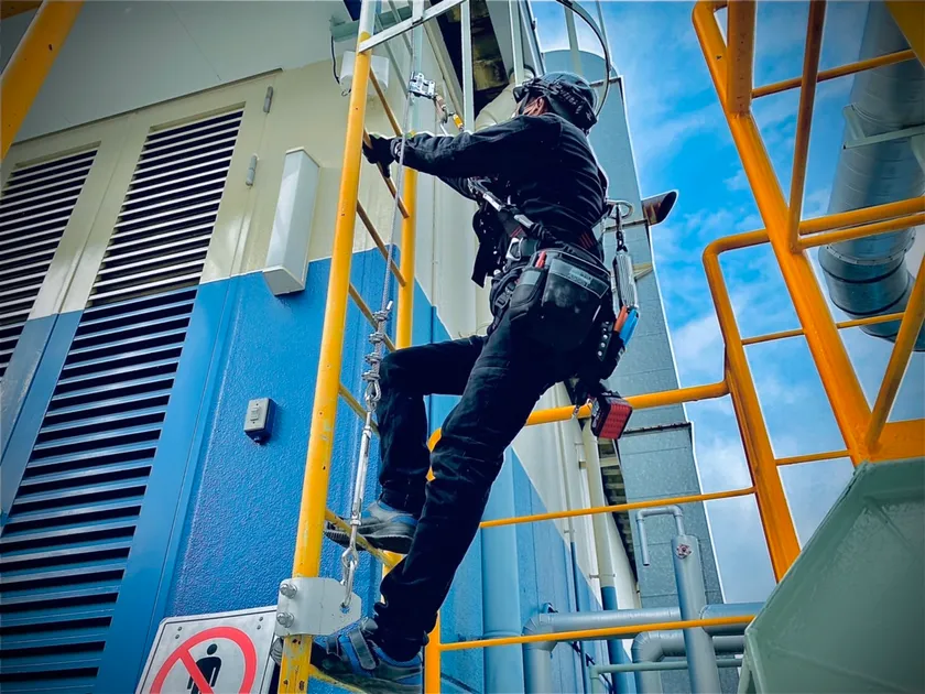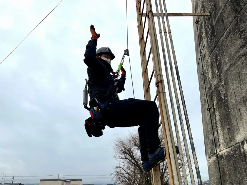 タラップや支柱など垂直面で作業をする作業員の墜落・転落を防止するシステムです。直径8ミリのワイヤーケーブルを上下に固定し、アブソーバーにより墜落の衝撃を吸収します。