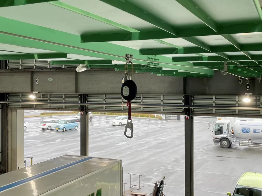 トラックヤード・石油貯蔵庫・航空機格納庫などでの墜落・転落防止に開発されました。天井付近に設置されたワイヤーが安全ブロックとともに作業者に自由な機動性と高い安全性をお約束します。