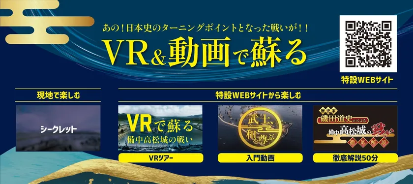 「備中高松城の戦いVR」専用ホームページでは備中高松城の戦いを資料に基づきリアルに再現した歴史追体験VRをはじめ、戦いの全容が10分で分かる「武士(もののふ)和を尊ぶ」と、歴史家 磯田道史氏による「備中高松城の戦い 徹底解説」の2本の動画が楽しめます。
