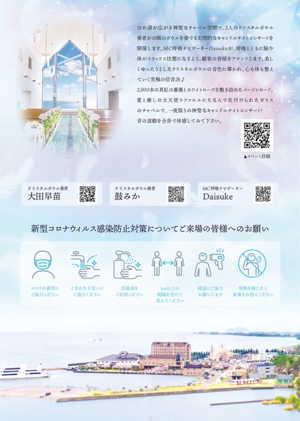 びわ湖が広がる神聖なチャペル空間で、2人のクリスタルボウル奏者が18個のボウルを奏でる幻想的なキャンドルナイトコンサートを開催します。