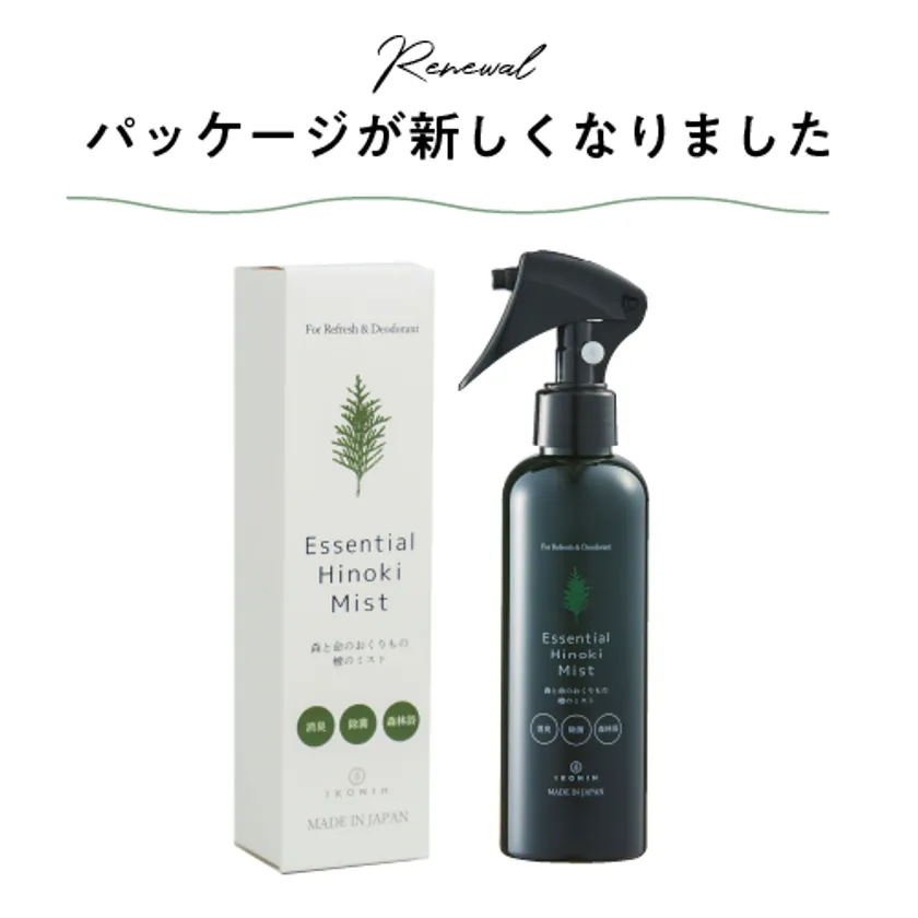 国産檜でつくられた家具・玩具ブランド「IKONIH(アイコニー)」を運営する丸紅木材株式会社(本社:大阪市中央区南船場1-18-17 商工中金船場ビル13階)が販売する、「IKONIH エッセンシャルひのきミスト」のパッケージをリニューアルいたしました。