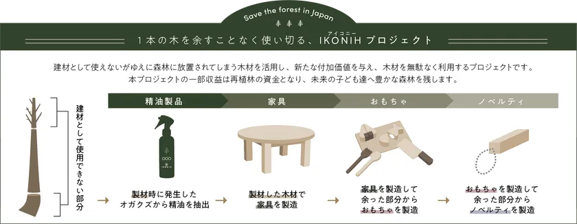 IKONIHでは、国産材の中でも檜に着目。特に、“建材として使えない、曲がった部分や根っこ”に需要が生まれるようにと、子ども向け家具・玩具ブランドを発足しました。