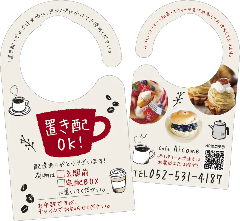 マグネットシートでの扉への貼り付け、形状がフックつきなので取っ手に掛けて使用出来ます。メニューやQRコード記載にて再注文を促す事が出来ます。