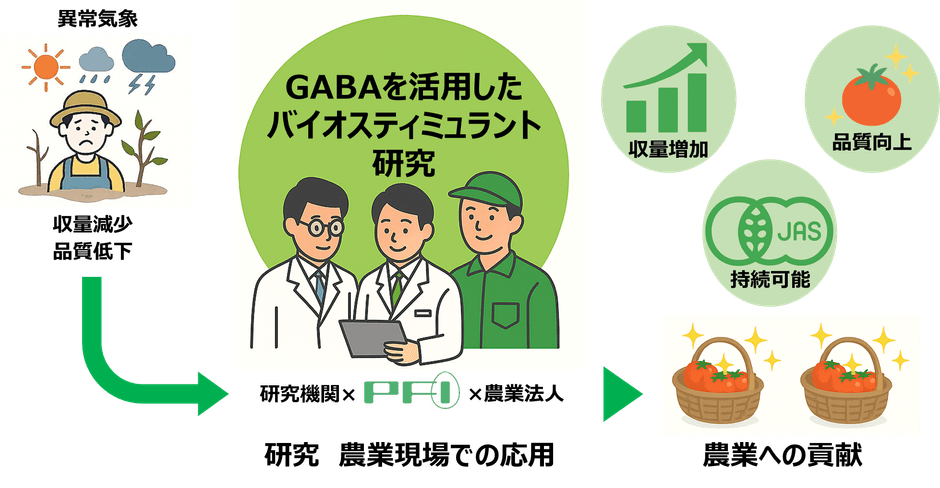これまで弊社は、「医」(Pharmaceutical)と「食」(Foods)の融合「ファーマフーズ」(Pharma Foods)を目指し、健康維持と生活の質(Quality of Life)の向上に役立つ機能性食品素材を開発してまいりました。特に、当社の主力素材である「GABA」は、ストレスの低減、睡眠の質の改善など、様々な食品機能を有することを見出してまいりました。このような機能性が、ヒトに限らず植物にも発揮された場合、猛暑や日照不足など、異常気象による農作物へ環境ストレスを緩和し、収量の改善や品質の向上に貢献できるのではないかと考え、フィールドでの実証実験に取り組みました。株式会社浅井農園、株式会社オーガニックnicoならびに奈良県農業研究開発センターの協力を得て、トマトを対象とした農場試験を行った結果、「GABA」の散布によって実際に農作物の環境適応能力が向上することが示され、その成果をそれぞれ園芸学会で発表いたします。これらの研究成果は、気候変動時代における農業課題解決の糸口のひとつとして期待され、今後、販売事業にも注力いたします。