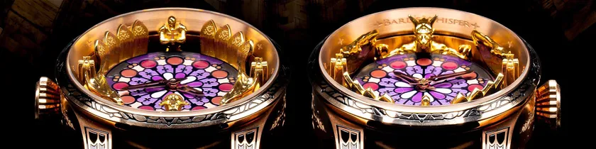 ウッチェロやラファエロが制作した有名な絵画「聖ゲオルギウスと竜」を職人の手作業によって時計内部に再現し、ゴシック調に仕上げた逸品になります。
