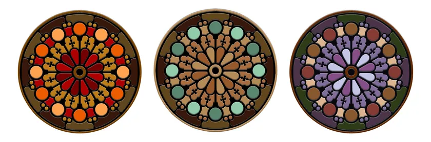 代表的なゴシック様式建築をテーマに、ケースの表面上下のラグには典型的なゴシック風ステンドグラス模様を描きました。