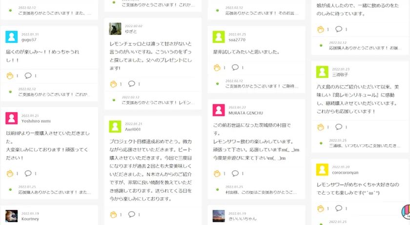 2022年1月14日(金)から2月27日(日)の期間、Makuakeにて大人のための甘くない本物レモンリキュール「八丈島レモンリキュールエイト」を数量限定で先行販売し、想定以上のご支援をいただきました。苗木から収穫まで約5年を掛け、1~3月の毎年1度、たった15トンしか栽培されない「八丈島レモン」。その希少なレモンを皮ごと丸ごと使用し、八丈島の老舗酒造が生産する八丈島本格麦焼酎「情け嶋」とブレンドした「八丈島レモンリキュールエイト」は、仕込みから全ての工程を手作業で行っており、年間でもたった4,000本しか生産することができません。そのため、当初は数量限定でお客様の手元にお届けする予定でした。ですが、八丈島島民の皆様をはじめ全国から数多くの支援とともに応援メッセージをいただいたことで、より多くの方に八丈島レモンの魅力を知っていただきたいという想いから、一般販売を開始する運びとなりました。この機会に、甘くない本物のレモン酒「八丈島レモンリキュールエイト」をお楽しみください。