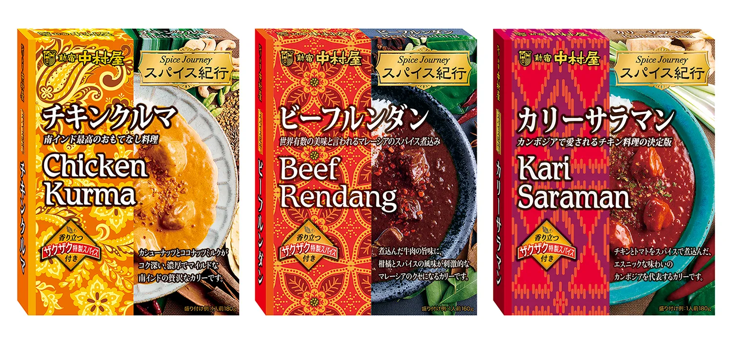 株式会社中村屋(本社:東京都新宿区、代表取締役社長 鈴木達也 東証プライム:2204、以下 中村屋)は、本格的な世界のスパイス料理をレトルト食品にした新シリーズからレトルトカレー「スパイス紀行 チキンクルマ」、「スパイス紀行 ビーフルンダン」、「スパイス紀行 カリーサラマン」を、2022年6月12日(日)より順次、全国のスーパー等で販売します。