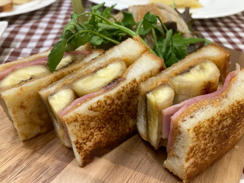 ピーナッツバターとともにベーコン、バナナを食パンにはさんでこんがり焼いた甘じょっぱいサンドイッチは、その組み合わせからは想像できないほどの美味しさで、一度食べていただくとやみつきになる味です。