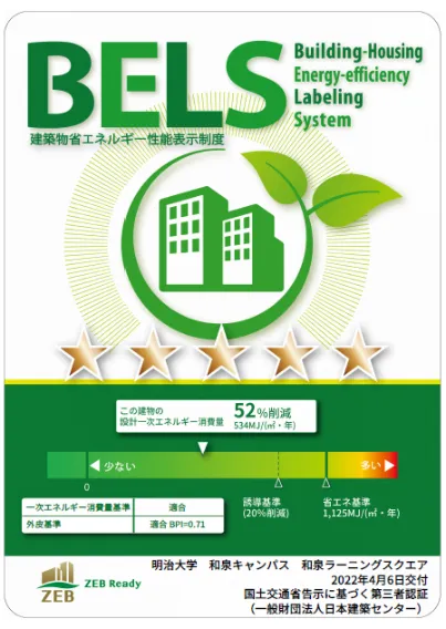 明治大学・和泉キャンパス(東京都杉並区)の新教育棟・和泉ラーニングスクエアが、省エネルギー化を実現した建築物として「ZEB ready」の認証を取得しました。(一財)日本建築センターによるBELS評価(建築物省エネルギー性能表示制度)を受け、4月6日付で交付されました。