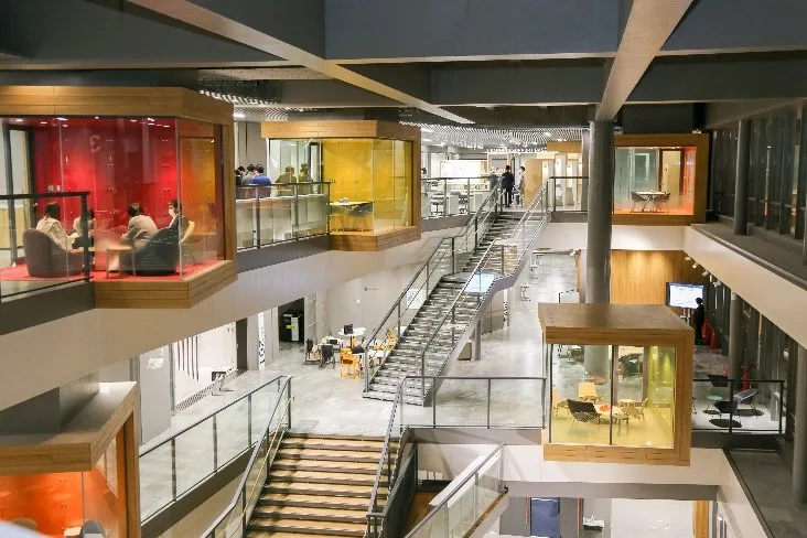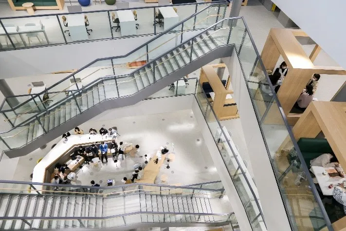 和泉ラーニングスクエアは、学修意欲を高めることを意図して、各フロアの学修環境が見渡せる吹き抜けを広く取り入れています。