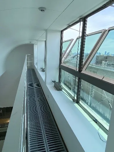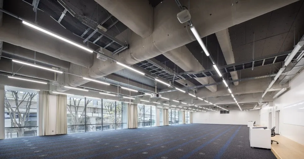 そうした中で、各フロアでは、人がいる高さだけを空調する床下空調による「居住域空調」や、開口部には特殊な金属膜のコーティングによって空調の効率が高められる「Low-Eガラス(エコガラス)」を採用しています。