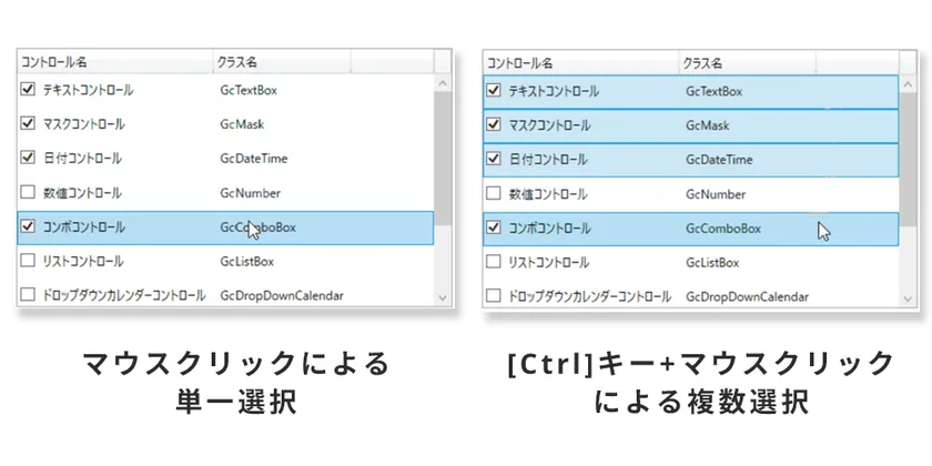 リストボックス(GcListBox)の項目を選択する方法を指定できます。単一または複数の項目をクリックやドラッグのマウス操作と、それに組み合わせて[Shift]や[Ctrl]によるキー操作などで選択するように設定することが可能です。