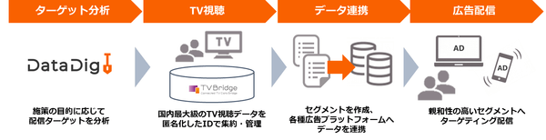 テレビ番組やCMの視聴データを「TVBridge DMP」に集約し、TV視聴ログデータを基にユーザーの視聴傾向の特徴を活かした配信セグメントの作成を行い、各種広告プラットフォームへ広告配信を行うことができます。