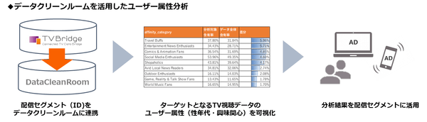 CCIで利用可能なメガプラットフォーマーが提供する個人情報と分離されたデータクリーンルーム環境と連携することで、TV視聴ログデータからターゲットセグメントのデモグラフィックや興味関心などのユーザー属性を可視化し、オンラインとオフラインメディアを横断した統合分析が可能となります。