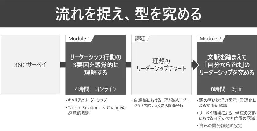 プログラムの全体像は、下図の通り、オンラインの回と対面の回の全2回で構成されています。リーダーシップの要素を体感的に理解する回(図中のModule 1)と、文脈を踏まえて「自分ならでは」のリーダーシップを究める回(図中のModule 2)です。