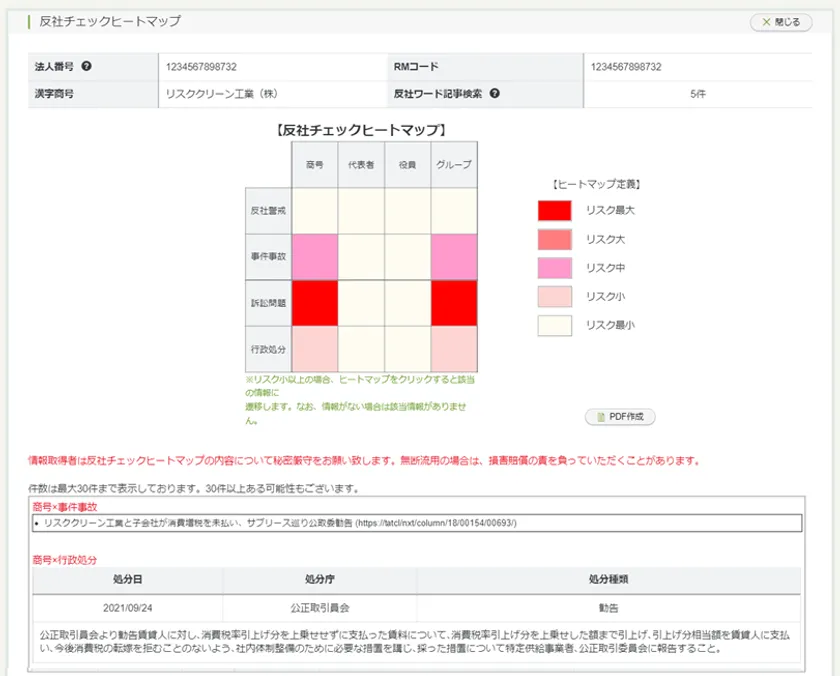 商談前の企業概要の把握、および、反社チェックの1次スクリーニングツールとしてご活用いただけます。