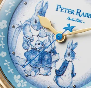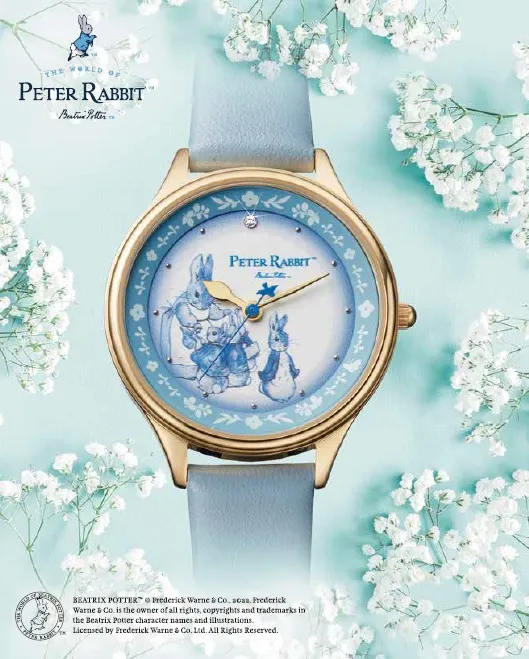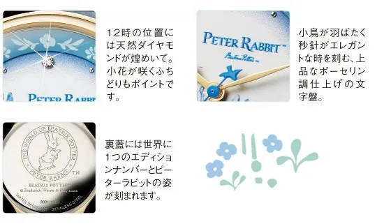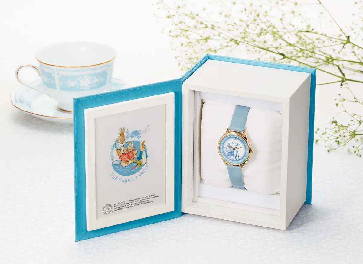 『ピーターラビットのおはなし』の名場面が浮かぶ文字盤には高級感あふれるポーセリン調仕上げが施され、小花が可憐に咲く優しい水色のリングがふちどります。