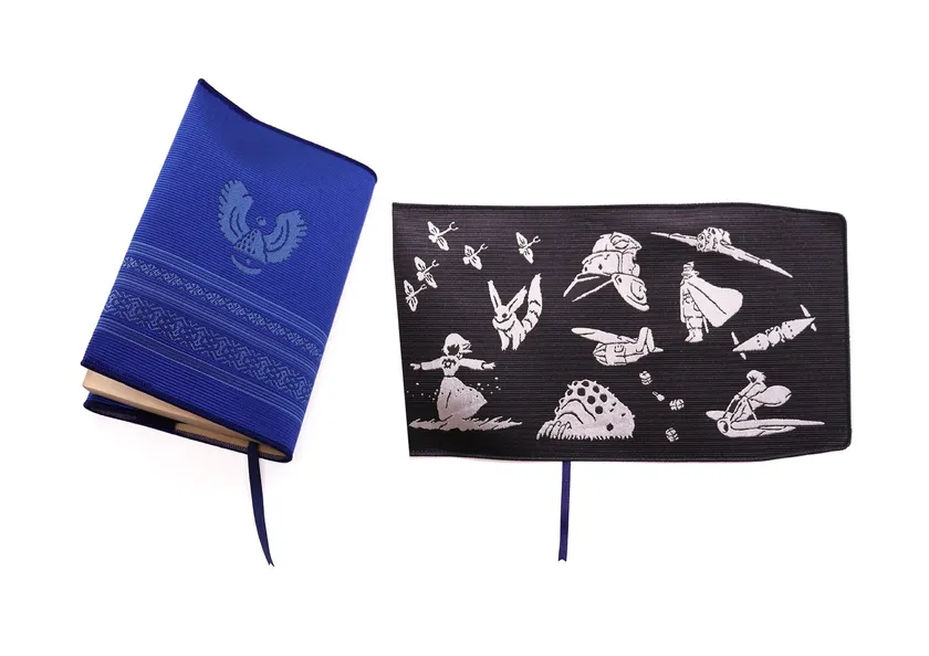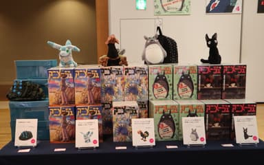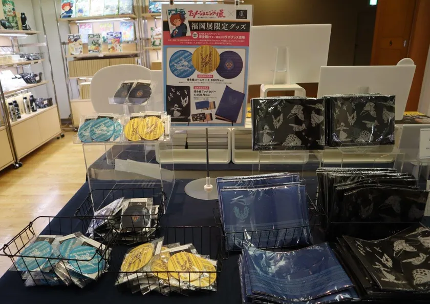 会場のグッズコーナーでは、「風の谷のナウシカ」デザインのタペストリーや青色のテトのぬいぐるみなど約150点の本展オリジナルグッズや福岡会場でしか買えない「サヌイ織物(博多織)×ジブリ作品」コラボグッズのコースターとブックカバーも登場。