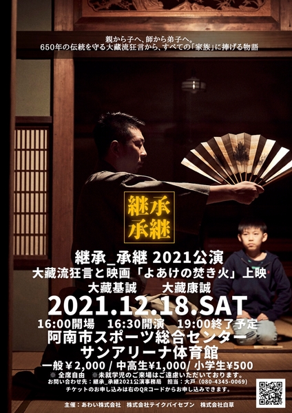 そこで本公演では、能楽師狂言方大藏流 大藏基誠(おおくら・もとなり)と康誠(やすなり)親子による大藏流狂言舞台とともに、その継承の瞬間を描いた映画「よあけの焚き火」、そして事業承継を重ねてきた 桜映画社 監督土井康一と大藏基誠による対談を通して、「 継承_承継 」のエッセンスを紐解いていきます。