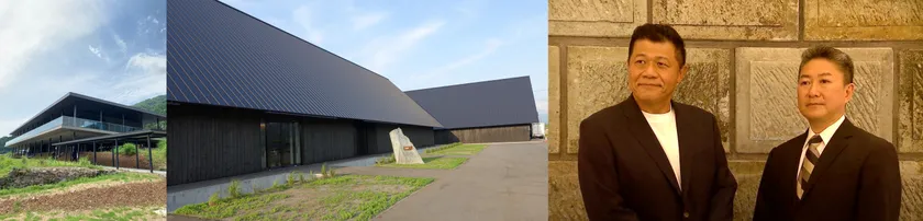 左はレストランや酒ショップがある「酒樂棟」、中央は酒貯蔵セラーがある「臥龍棟」、右写真の左側は、石田屋二左衞門 代表取締役 水野直人、右写真の右側は、黒龍酒造 醸造部部長 杜氏 畑山浩。(6月3日の記者会見にて)