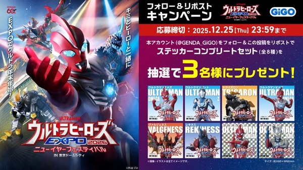 期間中、GiGO公式Xアカウントをフォローのうえ、対象の投稿を「リポスト」していただいた方の中から、抽選で3名様に「ウルトラヒーローズEXPO 2026 ステッカーコンプリートセット(全8種)」をプレゼントいたします。