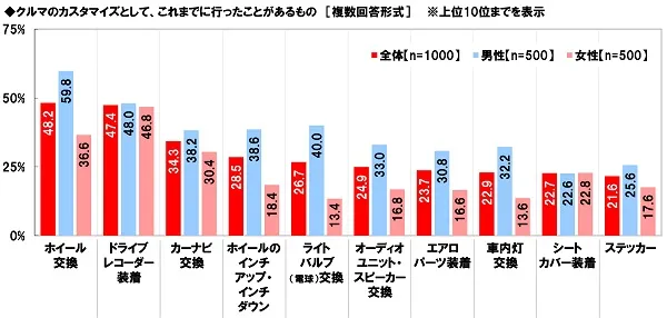 男女別にみると、男性では「ホイール交換」が23.2%、「ドライブレコーダー装着」が22.4%、「ホイールのインチアップ・インチダウン」が15.4%、「エアロパーツ装着」が12.8%、「マフラー交換」が12.6%と、女性(順に17.0%、15.2%、9.8%、6.4%、3.6%)と比べて5ポイント以上高くなりました。