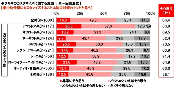 また、防災について聞いたところ、【車中泊仕様にカスタマイズすることは防災対策の1つだと思う】では『そう思う(計)』は63.6%となりました。