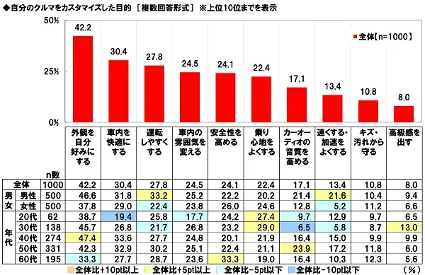 「外観を自分好みにする」42%、「車内を快適にする」30%、「運転しやすくする」28%