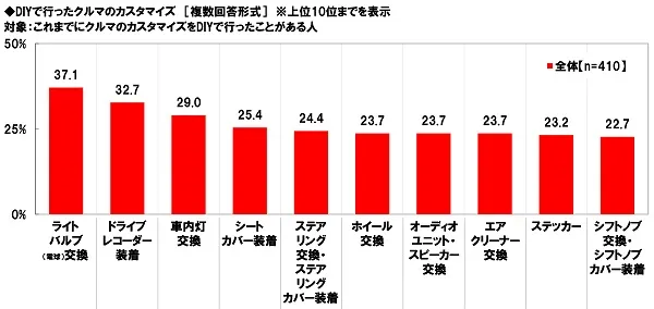 これまでにクルマのカスタマイズをDIYで行ったことがある人(410名)に、DIYで行ったクルマのカスタマイズを聞いたところ、「ライトバルブ(電球)交換」(37.1%)が最も高くなり、「ドライブレコーダー装着」(32.7%)、「車内灯交換」(29.0%)、「シートカバー装着」(25.4%)、「ステアリング交換・ステアリングカバー装着」(24.4%)が続きました。
