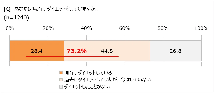 この先のライフステージを、より楽しく、自分らしく暮らす方法を探るシリーズ「人生100年時代」。今回のテーマは、「今どきのダイエット事情」。オレンジページが国内在住の成人女性1240人に調査したところ、ダイエットしようと思った理由の第1位は「健康のため」で、ダイエットに挫折した経験のある人は7割。体重を落としたいと取り組む人が多いものの、結果を出すのがむずかしい、悩み多き実態が見え隠れしています。また、糖質オフダイエットの流行もあり、70.5%の人が主食を抜くことがあると回答している一方で、主食を減らしても体重が「変わらない」が67.8%に上る現状が明らかになりました。