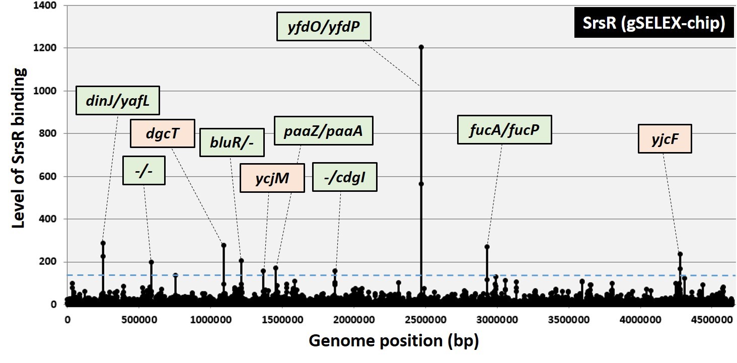 図1.本研究グループにより独自に開発されたGenomic SELEX法を用いて同定された機能未知転写因子SrsRの大腸菌ゲノム上の結合領域。結合領域の近傍に位置する遺伝子群が示されている(緑色は遺伝子間領域、橙色は遺伝子上領域を示す)。