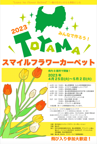 「2020スマイルフラワープロジェクト」を立ち上げ「フラワーロスの削減と花農家の積極支援」に取り組む株式会社ジャパン・フラワー・コーポレーション(本社:富山県射水市、代表取締役社長:松村吉章、以下「JFC」)は、4月25日(火)〜5月7日(日)の期間、富山の県花であるチューリップで色鮮やかなフラワーカーペットを創る市民参加型イベント『TOYAMA SMILE FLOWER CARPET 2023』を県内各所で開催いたします。