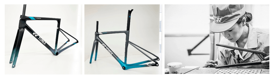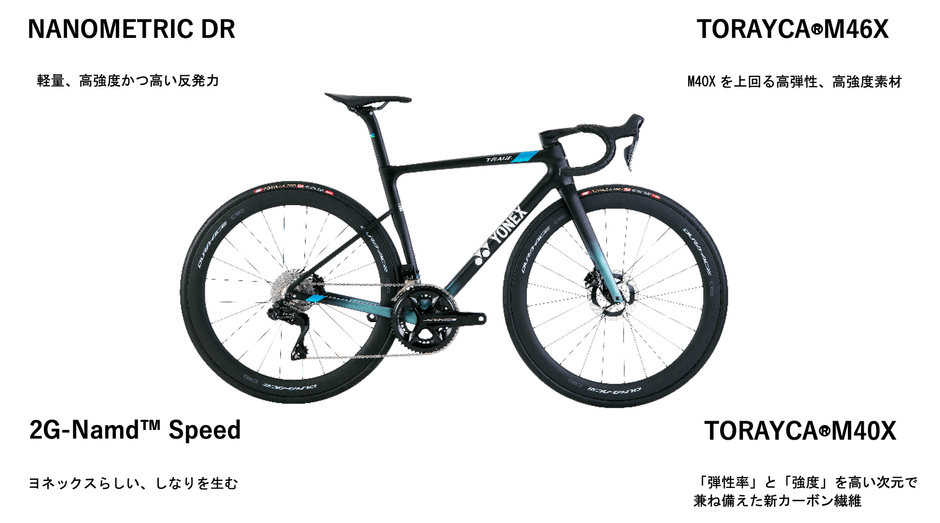 「TRACE」は、ヨネックスロードバイクの特長である「軽さ」と「しなり」に加え、「空力性能」を追求したフレームを採用。