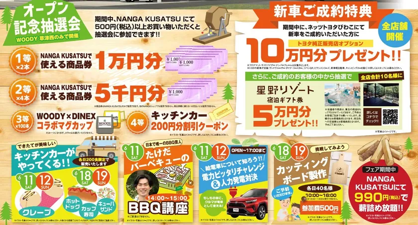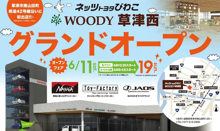 ネッツトヨタびわこ「WOODY草津西店」&「NANGA KUSATSU」 6月11日(土)からグランドオープンフェア開催