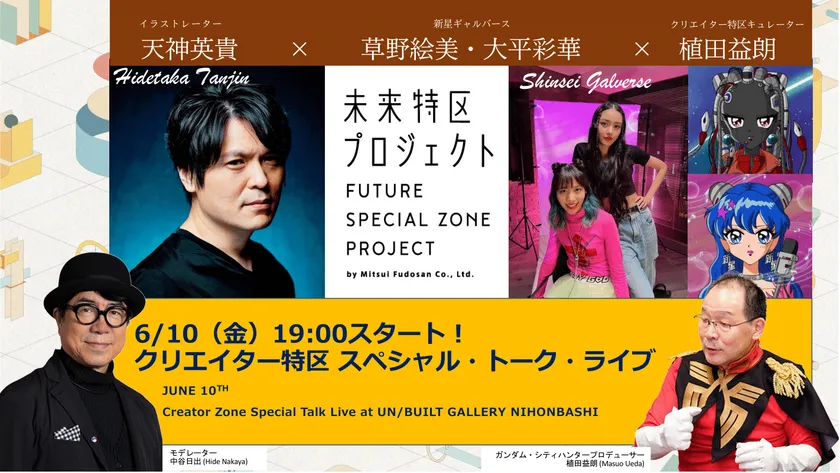 2022年5月27日に開幕した三井不動産株式会社80周年記念事業「未来特区」における「クリエイター特区」事業の推進サポートを行うマインドクリエイターズ・ジャパン株式会社は、リアル・VR・ARと網羅する日本橋UN/BUILTギャラリーのオープンと、日本のアニメ、イラスト、ゲーム界を代表する豪華参加アーティスト作品のNFTオークションを2022年6月18日にスタートすることを記念して、スペシャル・トーク・ライブを3回に渡り、開催します。