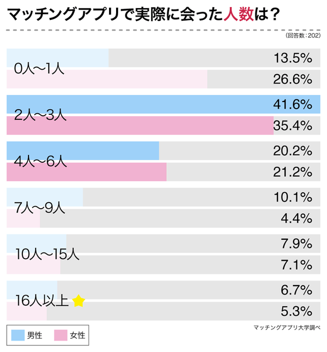 マッチングアプリで実際に出会った人数は、「2人〜6人」が多い